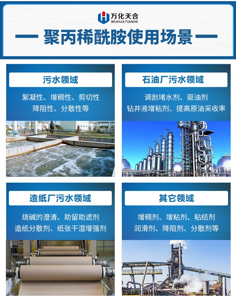 【使用方法】1、 使用時,產品配制成0.1%(指固含量)濃度的水溶液,以不含鹽的中性水為宜,配成稀溶液后極易水解。應隨配隨用或在當天用完,不宜長時間存放。當溶解液長時間放置,其性能將會視水質的情況而逐漸降低。如與聚合氯化鋁一起使用,先調配聚合氯化鋁水溶液,用量是酰胺的5-10倍,先投放聚鋁的水溶液在污水中,再投放酰胺的水溶液。